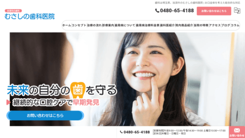 埼玉県加須市南大桑738-4に位置するむさしの歯科医院は、花崎駅から徒歩約10分の場所にある。6台分の駐車スペースを完備し、乳幼児連れや高齢者も車で訪問しやすい立地条件を整えている。診療は土曜日も13時30分から17時まで対応しており、平日の日中に時間を確保しにくい方にも受診の機会がある。木曜・日曜・祝日が定休日のため、週のスケジュールとの調整がしやすい。